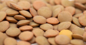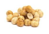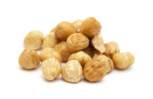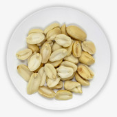 prażone orzechy solone w misce biały z czarnym paskiem, strzał z góry, na białym tle
