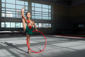 Dziewczyna nauczyć używać hoop w Gimnastyce Artystycznej.