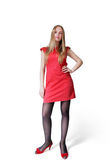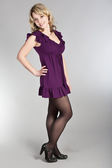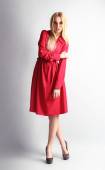 ładny blond brązowy dama sobie modne sukienki różowe. nową twarzą młodych. wyśmienity, jednolite tło