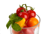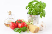 makaron spaghetti z pomidorami, bazylią i czosnkiem na białym tle