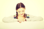 Zdjęcie "młoda kobieta z pustym billboardem." może być wykorzystywane do celów osobistych i komercyjnych zgodnie z warunkami zakupionej licencji Royalty-free. Obraz jest dostępny do pobrania w jakości wysokiej rozdzielczości do 5760x3840.