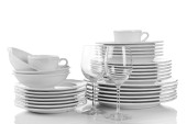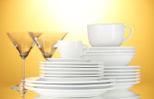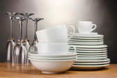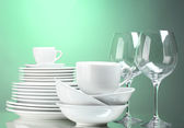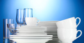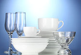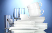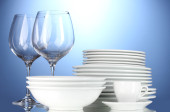 puste miski, talerze, kubki i szklanki na niebieskim tle