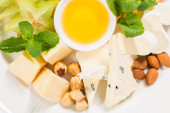 różnych rodzajów sera z miodem, orzechami i winogron na płycie,