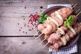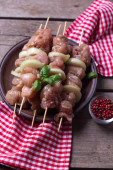 Zdjęcie "Raw shashlik on plate on aged wooden" może być wykorzystywane do celów osobistych i komercyjnych zgodnie z warunkami zakupionej licencji Royalty-free. Obraz jest dostępny do pobrania w jakości wysokiej rozdzielczości do 5760x3840.