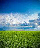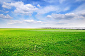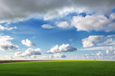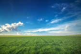 Pole pszenicy przeciwko niebieskiemu niebu z białymi chmurami