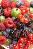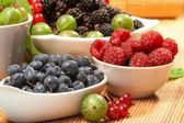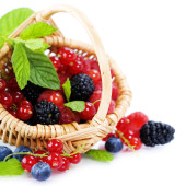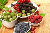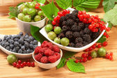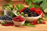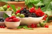 jagody w płytkach, na stole, wśród zielonych liści