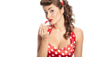 Sexy kobieta na sobie czerwoną sukienkę z na białym tle papryka chili