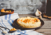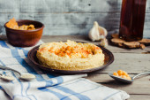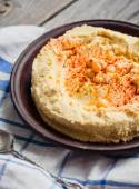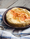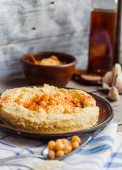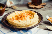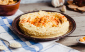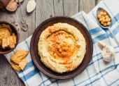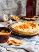 hummus z ciecierzycy, tachinowa i z papryka, rustykalne tła