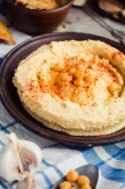hummus z ciecierzycy, tachinowa i z papryka, rustykalne tła