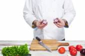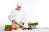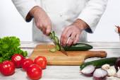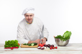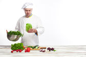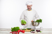 Szef kuchni w swojej kuchni sałatką ze świeżych warzyw
