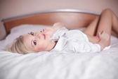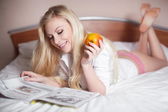 piękne zmysłowy sexy młody blond kobieta w łóżku czytania magazynu