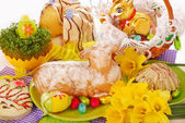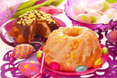 tort migdałowy pierścień Wielkanoc na drewnianym stole