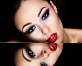 portret moda model piękna brunetka dziewczyna w okularach z birght makijaż różowy usta i niezwykłe haistyle jasne kolorowe tła z akcesoriów