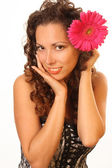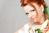 portret piękne uśmiechający się imbir Rude kobiety w żółte tkaniny z żółtym różowy kolorowe kwiaty we włosach na białym tle biały gospodarstwa kwiaty