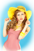 portret piękne uśmiechający się imbir Rude kobiety w żółte tkaniny z żółtym różowy kolorowe kwiaty we włosach na białym tle biały gospodarstwa kwiaty