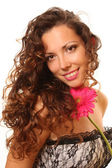 portret piękne uśmiechający się imbir Rude kobiety w czerwonego sukna z żółty różowy kolorowe kwiaty we włosach na białym tle biały z cytryny w ręce