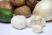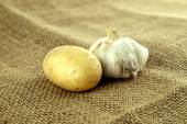 Zbliżenie cały żółty ziemniak infront z cebula i czosnkiem
