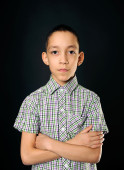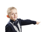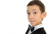 chłopiec szkoły w czarnym garniturze na białym tle