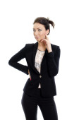 nieśmiały atrakcyjny brunetka dziewczynka. na białym tle.