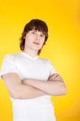 dorywczo młody człowiek w biały t-shirt. na białym tle.
