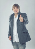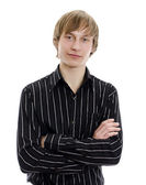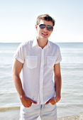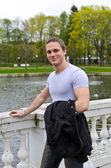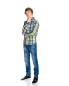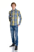 dorywczo młody człowiek w biały t-shirt, skórzaną kurtkę i dżinsy. na białym tle.