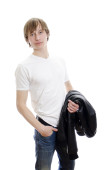 dorywczo młody człowiek w biały t-shirt i skórzaną kurtkę w ręce. na białym tle.