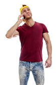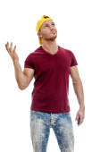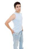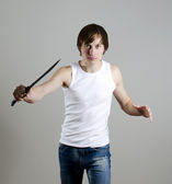 sztuki walki. człowiek z nunchucks. na białym tle nad białym.