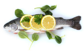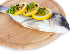 świeże ryby z cytryna, pietruszka, pieprz na deski do krojenia drewniana na białym tle