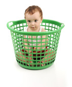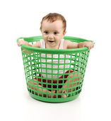 cute dziewczynka siedzi w pralni koszyk na białym tle