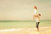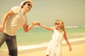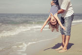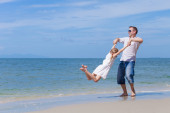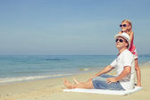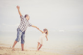 Ojciec i córka gra na plaży w czasie dnia.