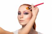 Kobieta z jasnej karnacji z uroda długie kręcone Rude włosy. Na białym tle.