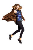 Sexy Beauty Girl. Fashion Blonde. Portrait of a girl dressed in grey coat and sunglasses, wearing a beige bag posing on a grey background.