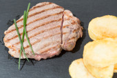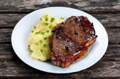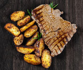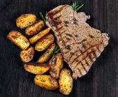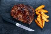 Home Cooked Medium rare grilled Beef steak Ribeye with roasted potato. on blue stone background