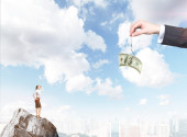 A young businesswoman looking in front ready to climb a career ladder in shape of a bar chart made of coins, blue sky at the background.