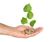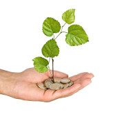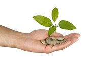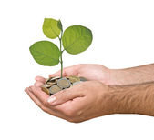 dłonie z growng drzewo ze stosu monet