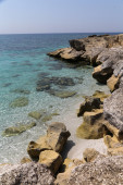 Zdjęcie "Skaliste wybrzeże rozciąga się na odległość poza horyzont niebieski ocean przeciwko czystego, bezchmurne niebo" może być wykorzystywane do celów osobistych i komercyjnych zgodnie z warunkami zakupionej licencji Royalty-free. Obraz jest dostępny do pobrania w jakości wysokiej rozdzielczości do 5760x3840.