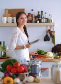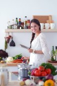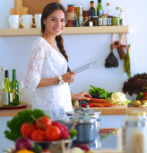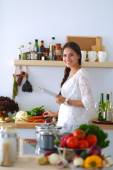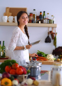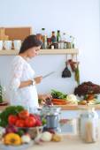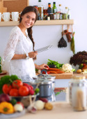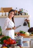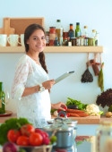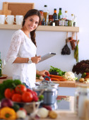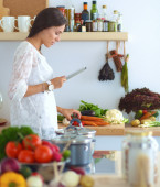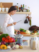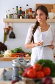 Młoda kobieta używa tabletu do gotowania w kuchni