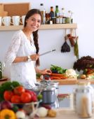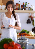 Zdjęcie "Młoda kobieta stojąca przy biurku w kuchni" może być wykorzystywane do celów osobistych i komercyjnych zgodnie z warunkami zakupionej licencji Royalty-free. Obraz jest dostępny do pobrania w jakości wysokiej rozdzielczości do 5760x3840.
