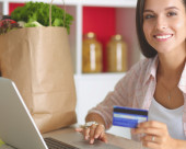 Zdjęcie "Uśmiechający się włos zakupy online za pomocą tabletu i karty kredytowej w kuchni" może być wykorzystywane do celów osobistych i komercyjnych zgodnie z warunkami zakupionej licencji Royalty-free. Obraz jest dostępny do pobrania w jakości wysokiej rozdzielczości do 5760x3840.