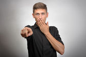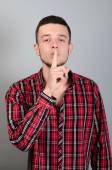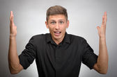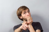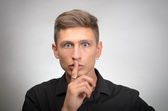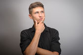 młody, przystojny mężczyzna wątpliwości na białym tle nad szarym tle