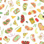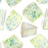 A seamless watercolor pattern with the hard Dutch cheeses and blue cheeses. Painted on a white background.