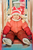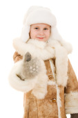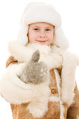 dziewczyna w ciepłą odzież uprzejmie, machając ręką na białym tle.