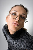 piękna dziewczyna z Rude włosy, noszenie okularów, całowanie na białym tle.