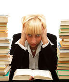 piękna rudowłosa dziewczyna w okularach czyta książki.