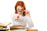 piękna rudowłosa dziewczyna w okularach czyta książki.