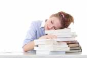 piękna rudowłosa dziewczyna w okularach czyta książki.