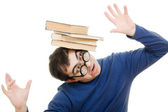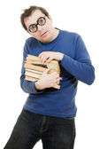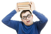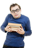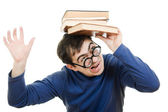 piękna rudowłosa dziewczyna w okularach czyta książki.