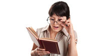 piękna rudowłosa dziewczyna w okularach czyta książki.