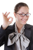 uśmiechający się biznes dama gest pokazuje dobrze.