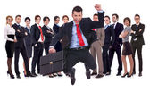 człowiek biznesu gospodarstwa teczki skoki przed zespołem
